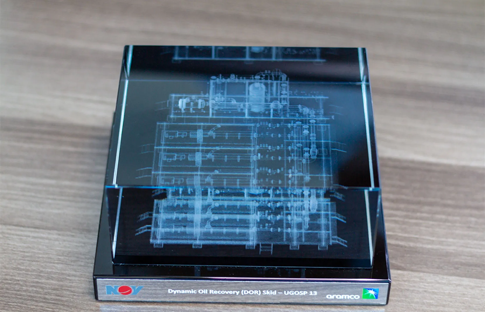 In the high-stakes world of oil, gas, and renewable energy, achievements are measured by technical precision and operational success. This 3D crystal block is an ideal commemorative for major projects involving global leaders like NOV and Aramco. Whether celebrating the deployment of a new Dynamic Oil Recovery Skid or a long-term service agreement, the 3D model serves as a permanent, tangible record of technical triumph. Its substantial weight and industrial aesthetic make it a respected addition to boardroom displays and executive galleries across the Middle East.
