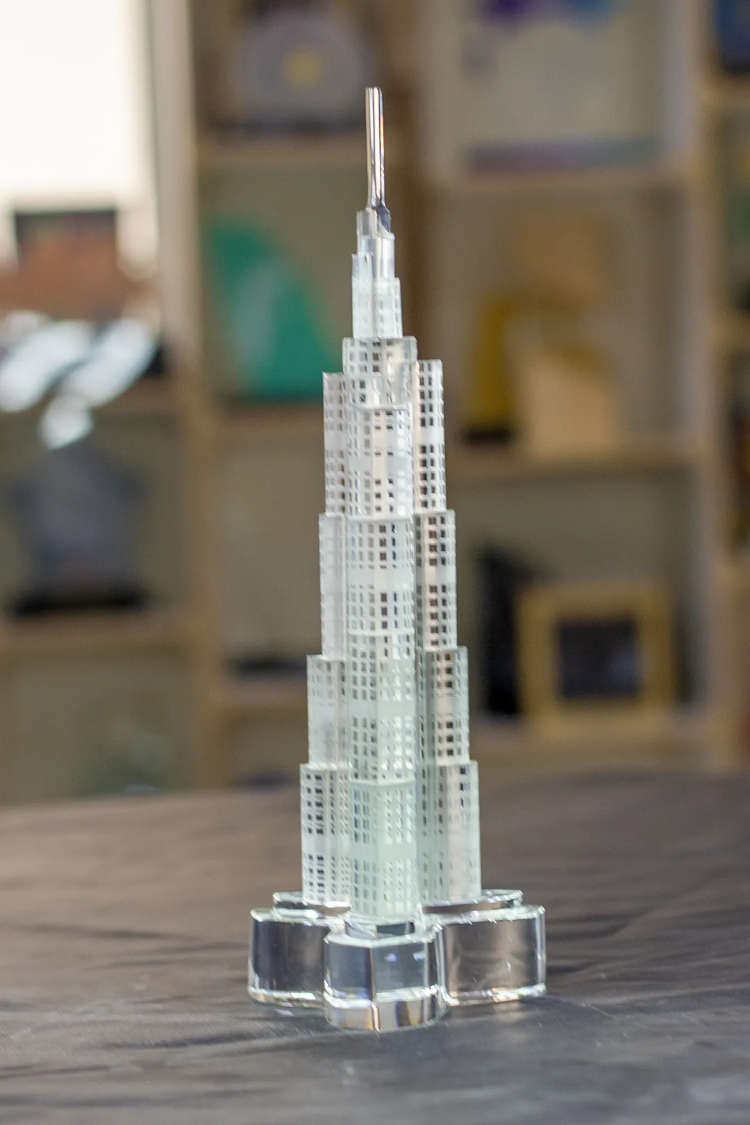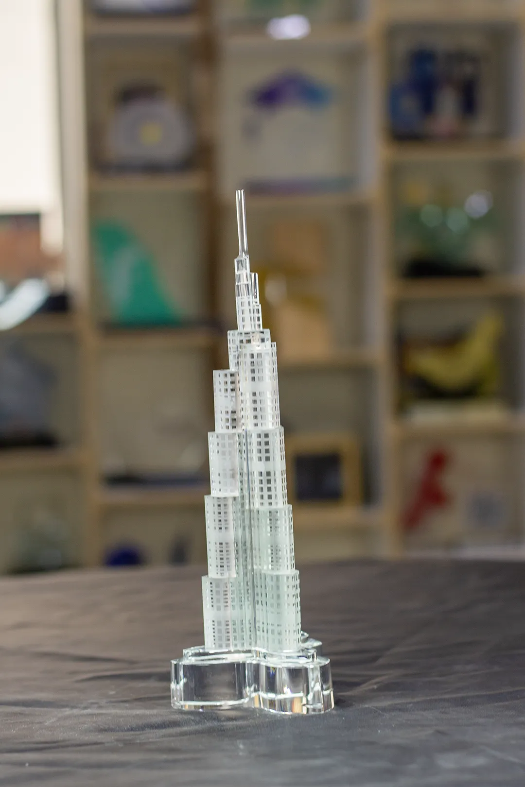 The base of the crystal model mimics the unique Y-shaped footprint of the actual tower, ensuring stability while maintaining the sleek, vertical aesthetic of the landmark. Whether displayed in a corporate lobby, a government office, or a private collection, this crystal model stands as a symbol of reaching new heights and achieving the impossible.