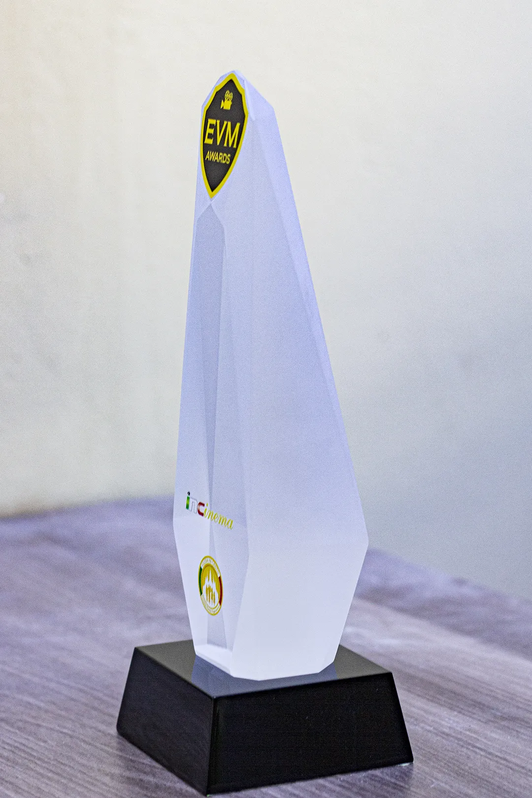 The EVM Awards Shield: At the apex of the trophy sits a bold, yellow-and-black shield logo. The inclusion of a small film camera icon within the “EVM” branding immediately identifies the award’s cinematic purpose. The UV-printed logo is applied with such precision that it appears integrated into the crystal itself.