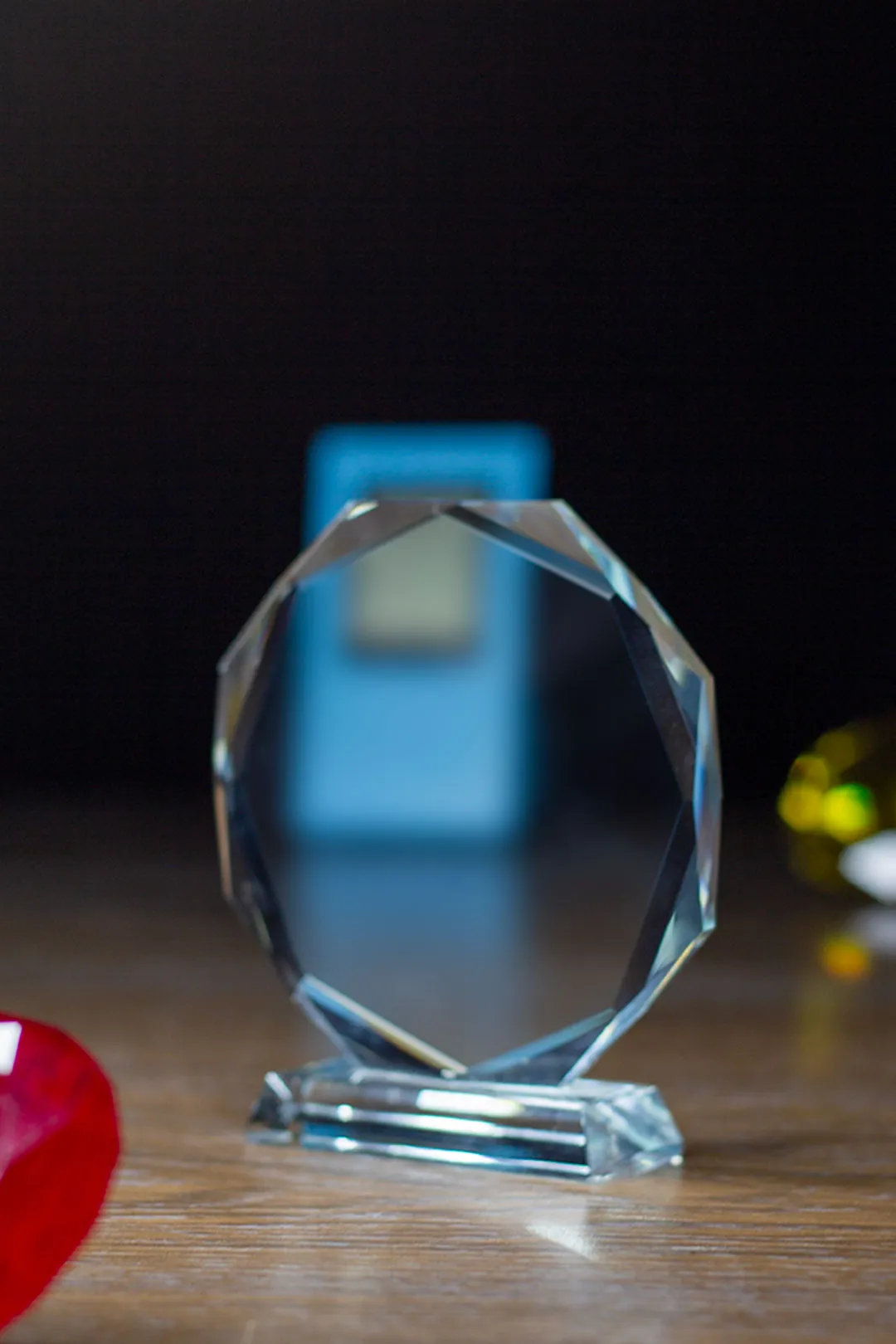 The Faceted Circular Decagon Crystal Plaque is a sophisticated evolution of the classic circular award. By incorporating ten precision-cut facets around its perimeter, this plaque transforms a simple shape into a complex prism that captures and disperses light from every angle. This geometric design symbolizes a well-rounded excellence and the various facets of a successful career or project. At The Awards DXB, we developed this specific silhouette for organizations that seek a balance between traditional prestige and modern architectural design.
