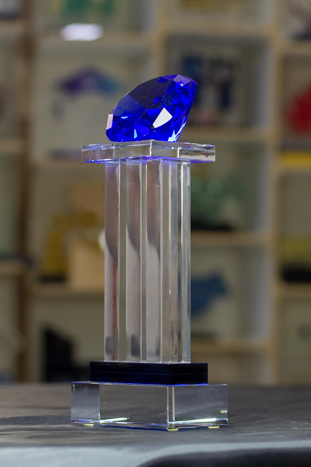 At The Awards DXB, we utilize only the finest optical-grade crystal for our premium collections. Unlike standard decorative glass, our optical crystal is entirely lead-free and manufactured to the same rigorous standards as lenses used in scientific equipment. This ensures that the pillars and base remain perfectly clear, with zero internal distortions or bubbles. The blue diamond component is infused with specialized metallic oxides during the smelting process to achieve that iconic, deep cobalt saturation that will never fade or lose its luster.