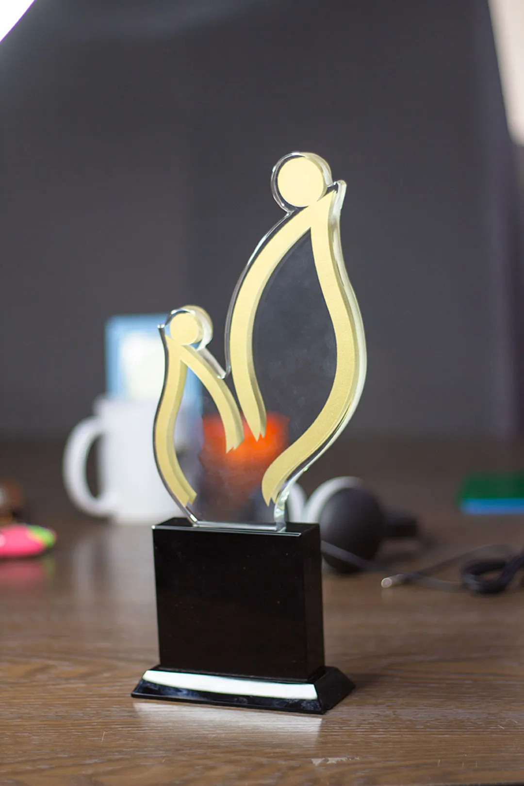 At The Awards DXB, we understand that an award must reflect the prestige of the event it represents. The dual-flame crystal components are polished to a brilliant, mirror-like finish, ensuring that every angle offers a new perspective on its beauty. The crystal is mounted securely on a substantial black crystal base, providing a weighted and premium feel that speaks to the award’s importance. The contrast between the translucent crystal, the radiant gold accents, and the deep black base creates a visual harmony that is both modern and timeless. This award is built to be a permanent fixture in any executive office or corporate gallery, maintaining its clarity and luster for years to come.