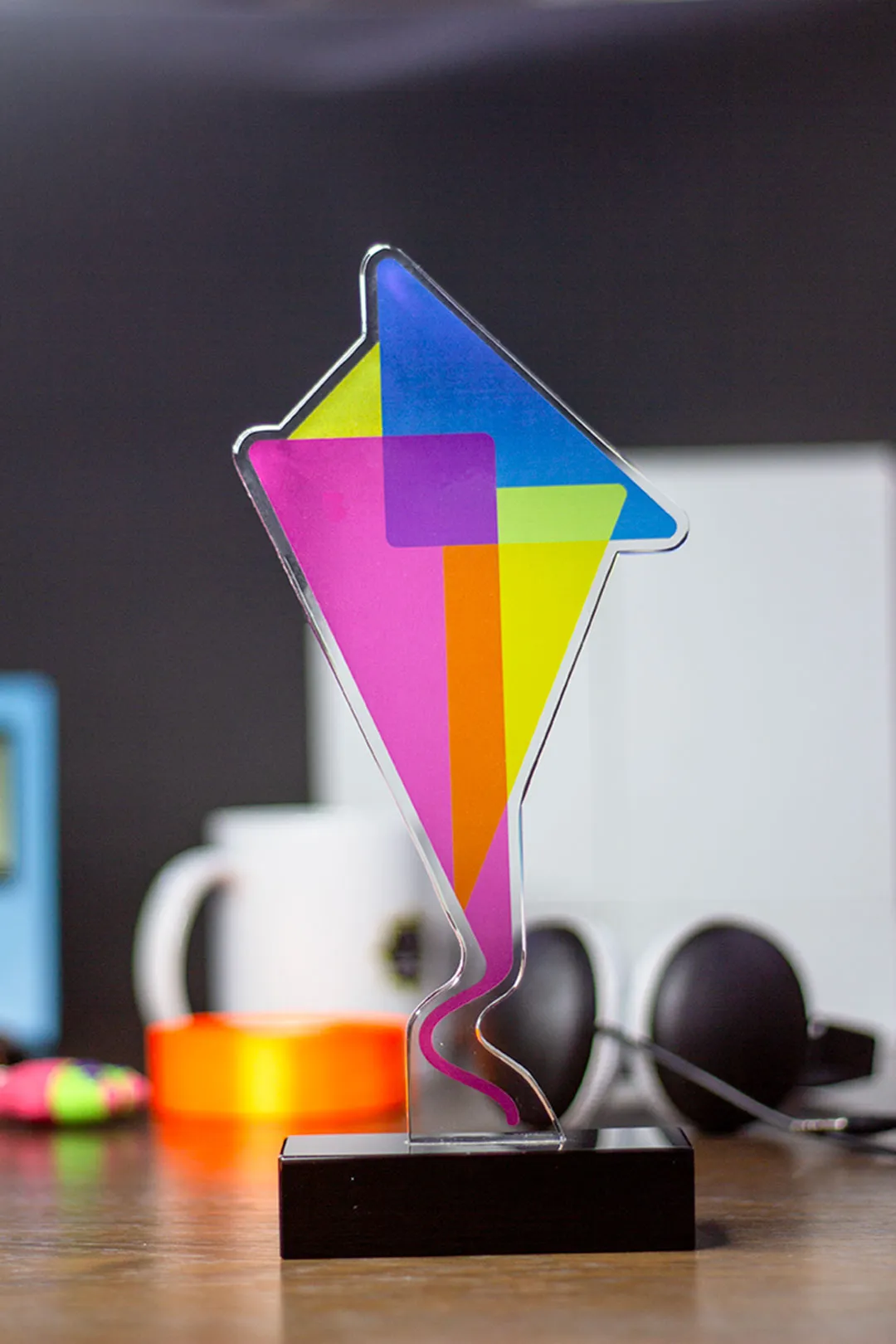 The Geometric Kite Crystal Award is not just a trophy; it is a statement piece designed for those who dare to dream big and reach higher. Crafted from premium-grade optical crystal, this award features a unique, abstract kite silhouette that symbolizes upward momentum, freedom, and the spirit of innovation. The sharp, clean lines of the crystal are complemented by a sophisticated play of colors. Using advanced UV printing and layering techniques, the award showcases overlapping translucent shades of magenta, cyan, yellow, and orange. This creates a beautiful “color-mix” effect where the shapes intersect, giving it a three-dimensional depth that catches the light from every angle.