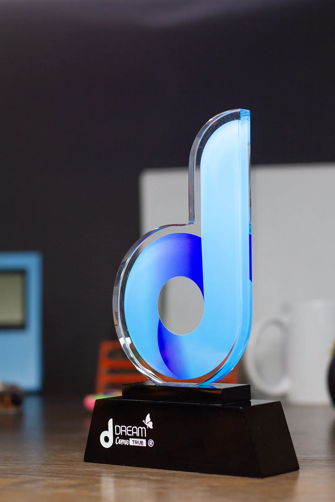 The Bespoke Dream Logo Cutout Crystal Excellence Award represents the frontier of modern trophy design, moving beyond standard geometric shapes to embrace the unique identity of your brand. Unlike traditional rectangular plaques, this award is precision-cut to follow the exact silhouette of your corporate logo, as seen in the elegant lowercase “d” design for Dream Come True. This advanced fabrication technique ensures that the award itself becomes a physical manifestation of your brand’s DNA. The Awards DXB specializes in these high-complexity cutouts, providing a level of customization that stands out in the competitive corporate landscape of Dubai and the wider UAE.