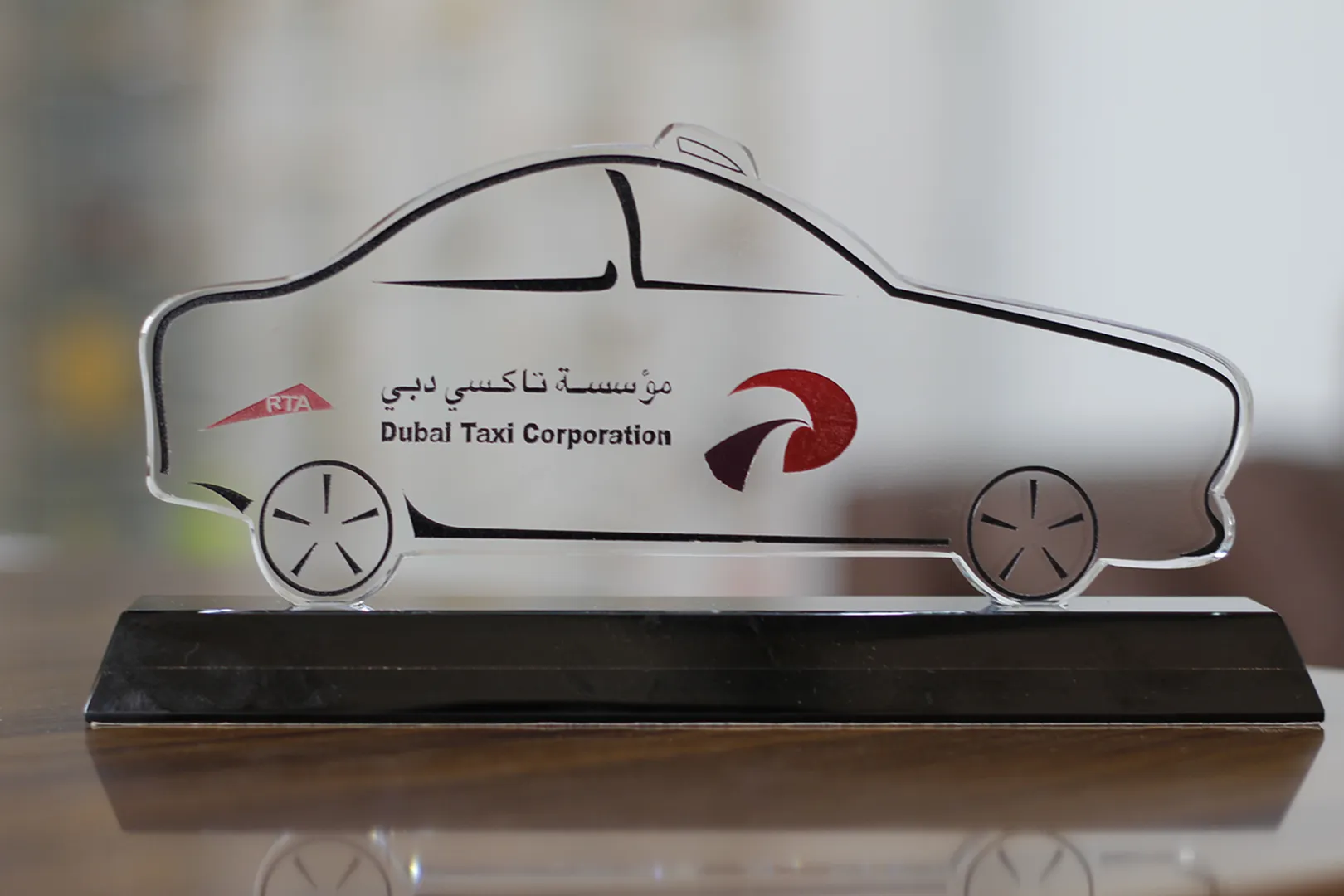The award is crafted from high-grade, optical-quality acrylic, chosen for its crystal-clear transparency and ability to catch the light. The most striking feature is its custom-cut contour, which follows the iconic outline of a modern sedan—the universal symbol of the Dubai Taxi fleet. This precision-cut silhouette includes subtle details such as the roof light and stylized wheel arches, giving the award a sense of movement and “motion” even while stationary.