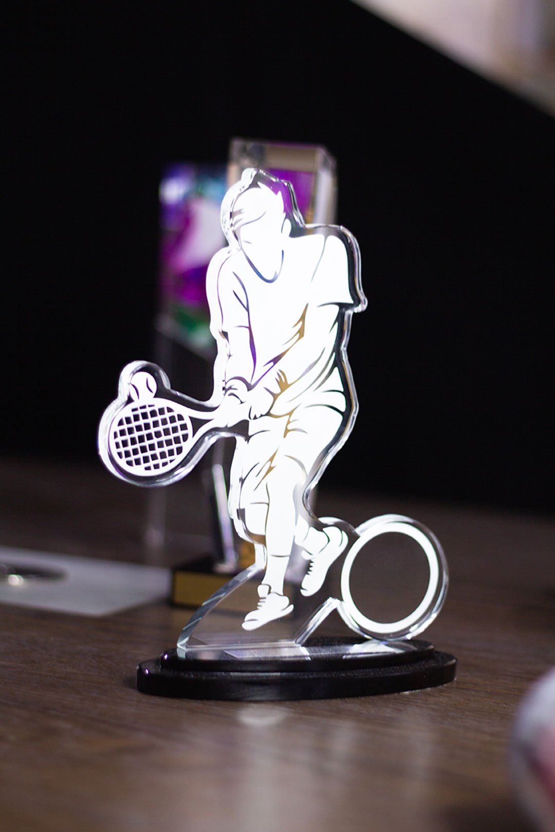 This award is a fantastic way to celebrate sporting achievement and excellence on the tennis court. Crafted from clear, high-quality acrylic, the piece features a dynamic, precise laser-cut outline of a tennis player in action. The clean, modern aesthetic is perfect for recognizing tournament winners, outstanding team members, or dedicated coaches. Mounted on a contrasting black base, this customized cutout design is clear, impactful, and easily personalized.
