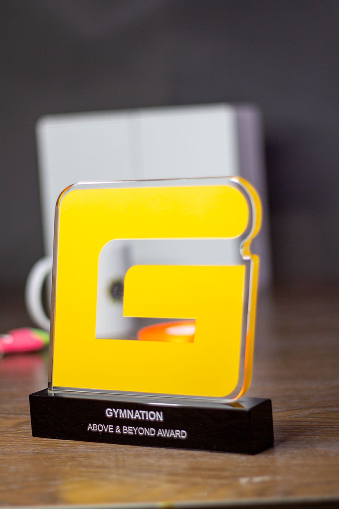 Recognize outstanding dedication and performance in the health and fitness sector with the Gymnation “Above & Beyond Award.” This custom trophy features the brand’s bold, angular yellow “G” logo in multi-layered acrylic or crystal, ensuring high visibility. Specifically designed for employee recognition programs, this award celebrates staff members who exceed expectations in customer service, sales, or team leadership within the fitness club environment. It is the ideal corporate gift for honoring excellence in the gym and wellness community.