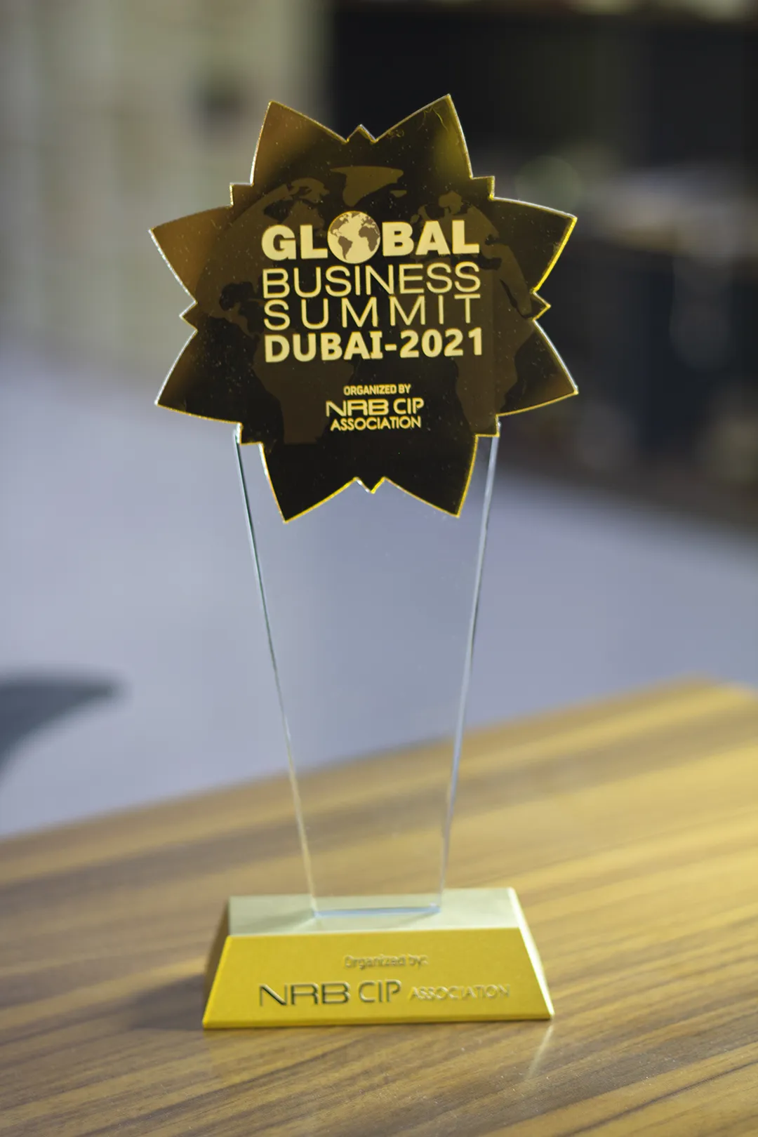 Typography & Branding: The event name, “GLOBAL BUSINESS SUMMIT DUBAI-2021,” is rendered in bold, white UV-printed lettering. Below this, the “Organized by NRB CIP Association” text is placed, ensuring that the host organization’s brand is permanently associated with the achievement.