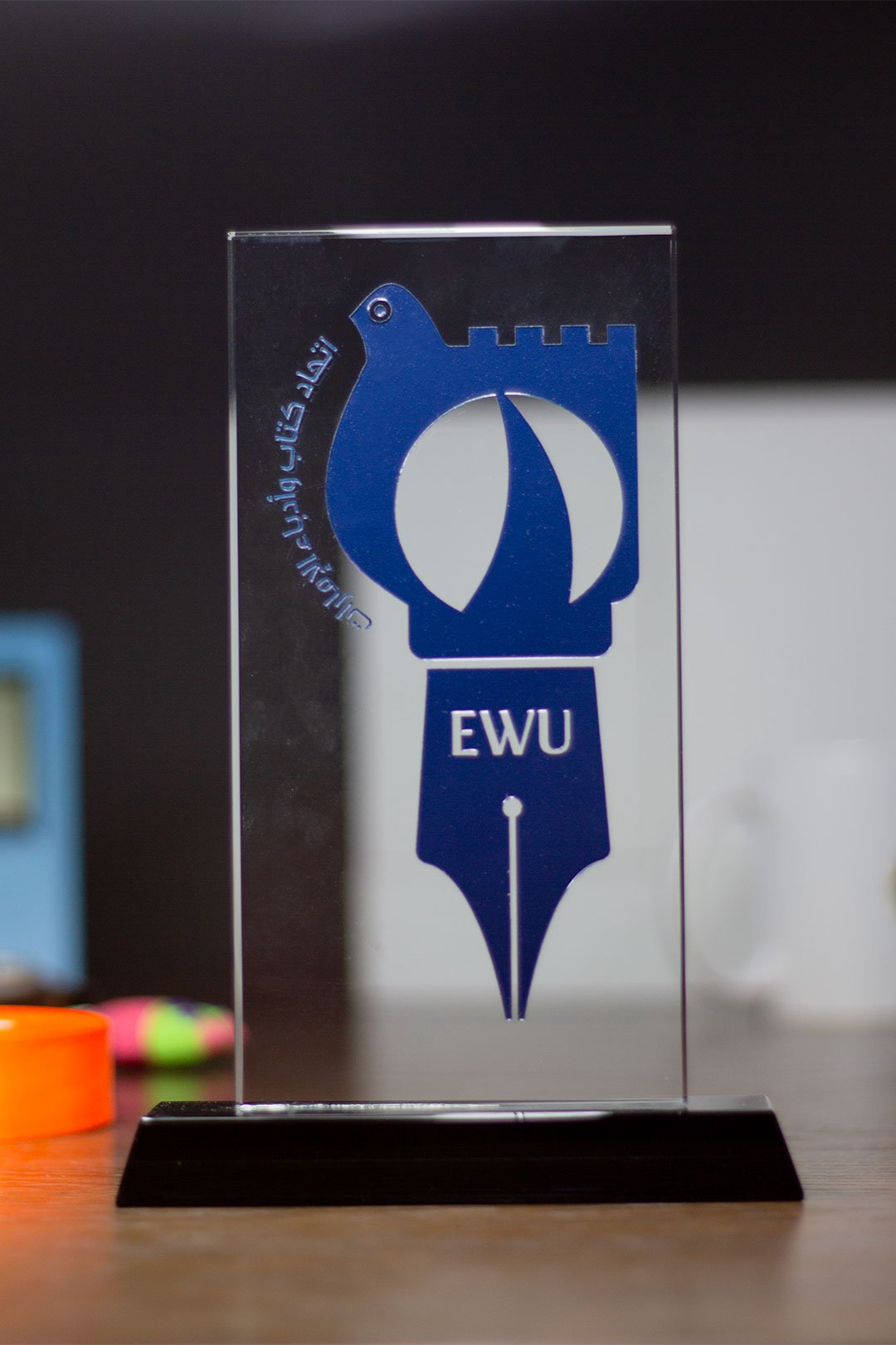 This bespoke clear crystal award features a custom-printed blue logo (EWU) and distinct Arabic script, highlighting its connection to a specific organization or event. The graphic combines elements of writing and structure, making it ideal for literary awards, writing competitions, or educational achievement ceremonies. Search for personalized corporate gifts, custom logo plaques, or event recognition awards to find this highly displayable and professional trophy. The solid black base ensures stability and a premium presentation.