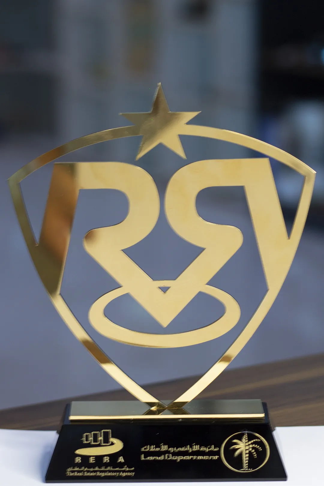 The design of the Regulator’s Shield is centered on the concept of “The Guardian of Growth.” The primary silhouette is a classic heraldic shield, a universal symbol of protection and integrity. By adopting this shape, the award communicates the protective role RERA plays in the Dubai real estate market—safeguarding investors, developers, and brokers alike.