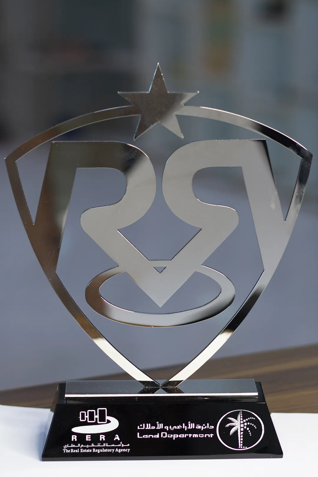Integrated into the very top of the shield is a five-pointed star, a symbol of high-level aspiration and the “Five-Star” service standards that Dubai is globally famous for. The central body of the shield features the stylized “R” and “D” elements of the official regulatory branding, laser-cut with such precision that the negative space becomes part of the design itself. This “open-frame” approach symbolizes the transparency and openness of the Dubai Land Department’s operations.