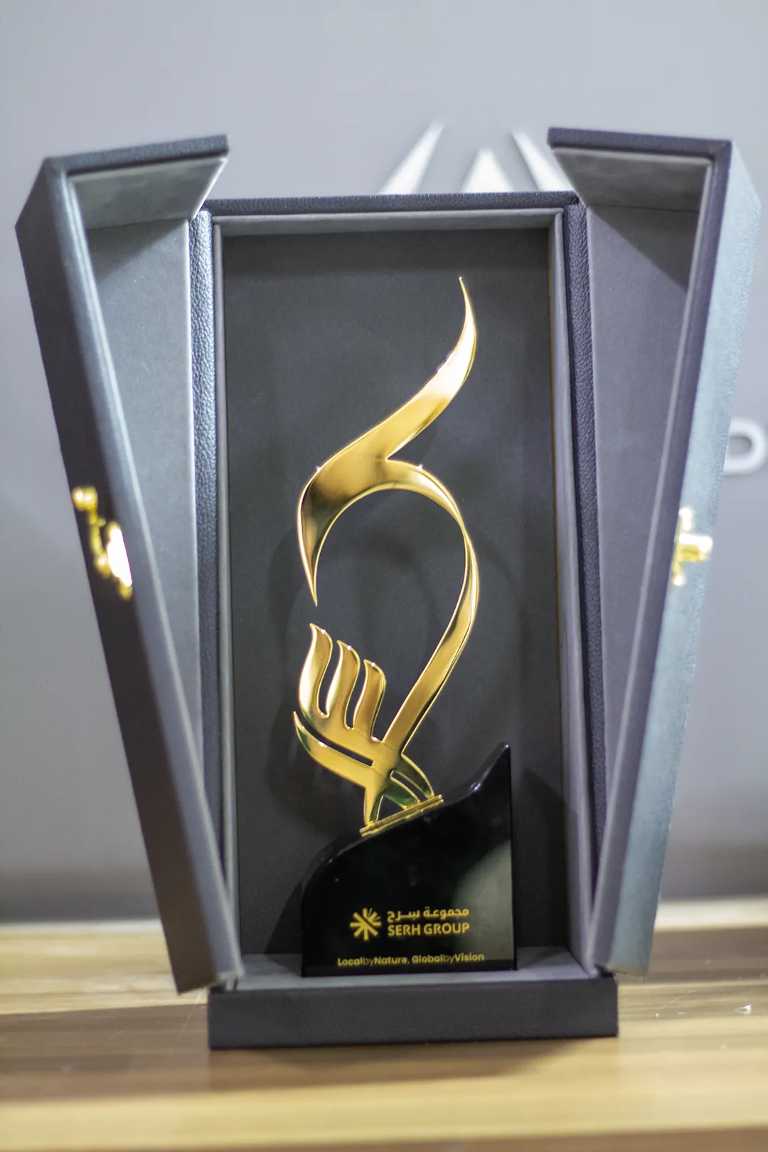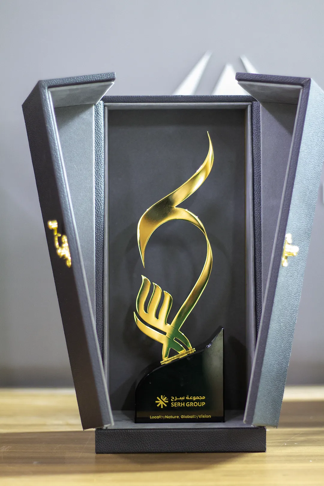 Branding is executed with surgical precision on the face of the black crystal base. The Serh Group logo and company name are applied using a specialized gold-inlay technique that perfectly matches the gold metal top. The text is bilingual, featuring both professional Arabic and English typography to reflect the international stature of the organization. Below the main branding, the corporate slogan “Local by Nature, Global by Vision” is etched with extreme detail, serving as a permanent reminder of the recipient’s alignment with the group’s core values. This level of detail ensures that the award is not just a gift, but a branded symbol of success.