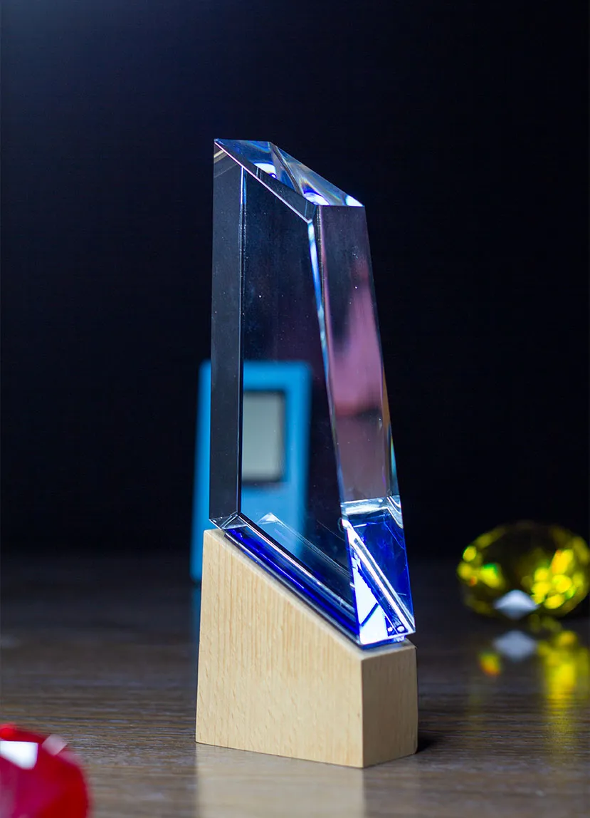 The Fusion Crystal Wedge Award represents a bold step forward in contemporary trophy design. By seamlessly integrating three distinct materials—high-clarity optical crystal, vibrant cobalt blue accents, and natural solid wood—this award tells a story of balance and innovation. The primary body is a geometric crystal wedge, precision-cut to capture ambient light, while the sapphire-hued base inset provides a deep, reflective glow that permeates the entire piece. This is anchored by a sharp-angled wooden pedestal that adds an organic, grounded feel to the prestigious design.