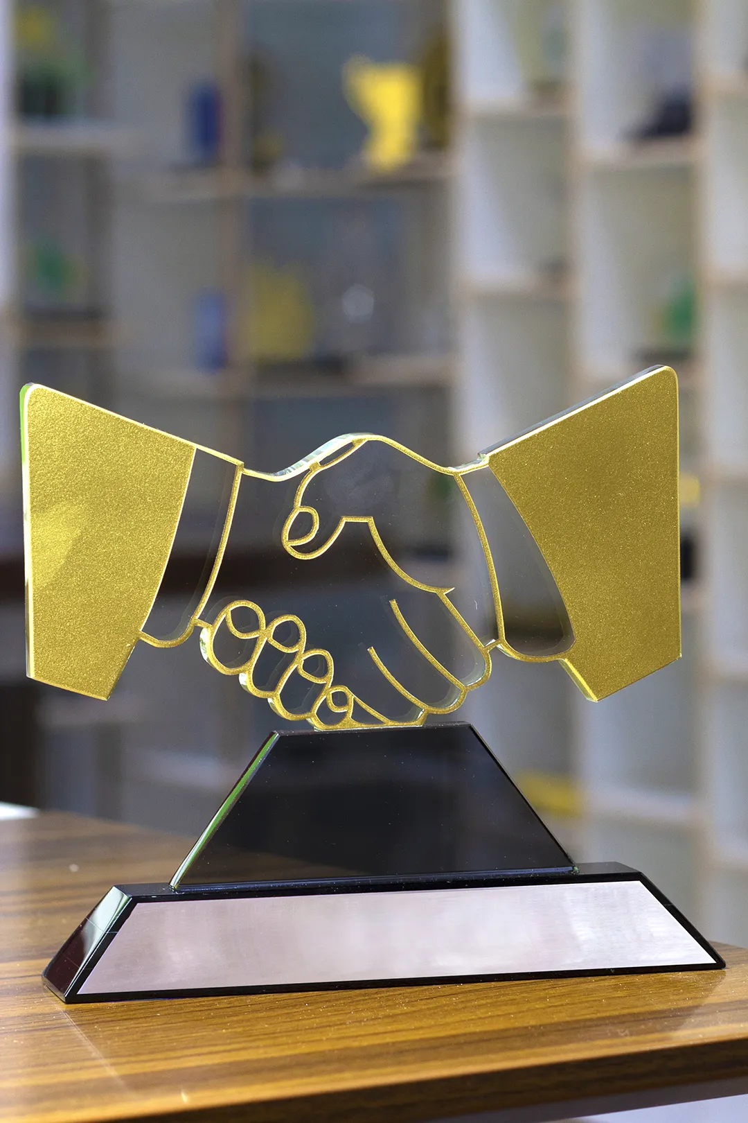 This “floating” imagery is achieved through thousands of microscopic laser points inside the glass, creating a holographic effect that signifies the depth and transparency required in any successful partnership. The handshake motif is universally recognized as the seal of a contract, the end of a negotiation, or the start of a joint venture. By suspending this image in crystal, the award suggests that while the deal may have been made in an instant, the impact of the partnership will be permanent.