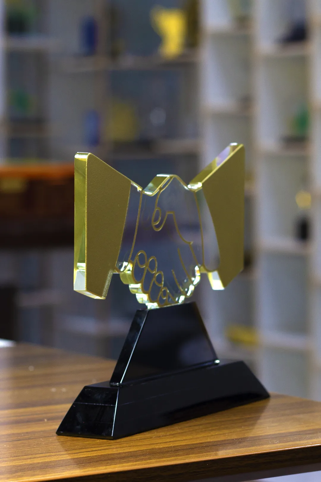 Gold-Plated Architectural Accents: Crowning the crystal pillar is a 24K gold-plated circular emblem. This metallic seal acts as a “seal of quality,” signifying that the partnership has reached the “Gold Standard” of corporate relations. The rich, deep luster of the gold provides a warm, luxurious contrast to the cool, transparent glass.