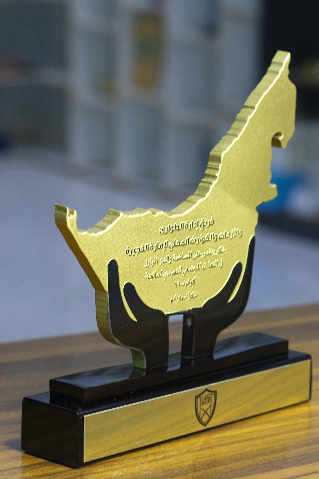 Supporting the map is a pair of stylized “guiding hands” cut from high-gloss black acrylic. This design element is deeply symbolic; the hands appear to hold the nation securely, representing the concepts of protection, support, and community care. This makes the award particularly suitable for organizations involved in crisis management, social services, or regional leadership, as seen in the dedication to the Emergency, Crisis, and Disaster Management team of Fujairah.