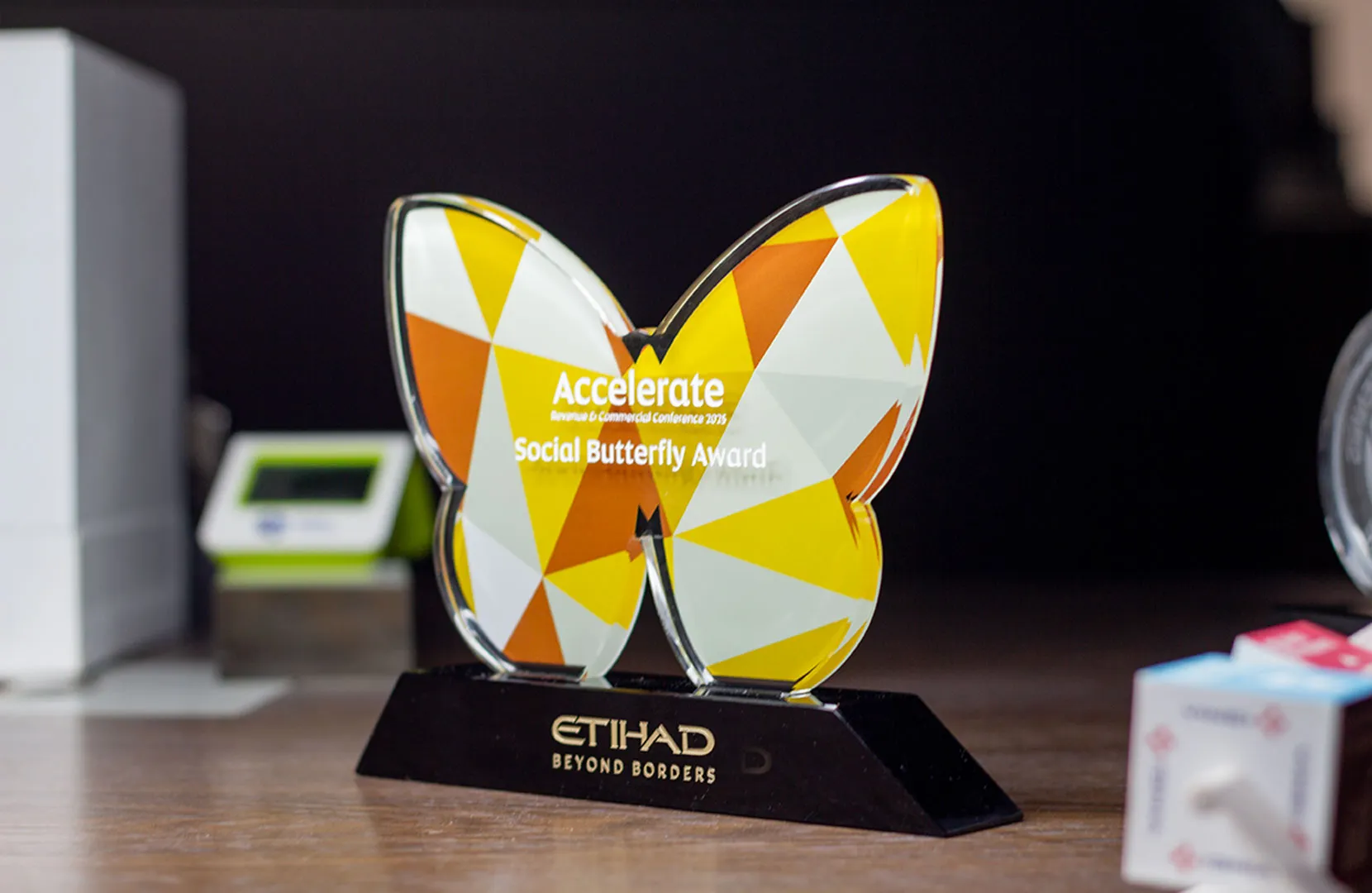 To match the high standards of the Etihad brand and the Dubai event scene, every Social Butterfly Award is delivered in a luxury, silk-lined presentation box. This ensures that from the moment the recipient receives the award, the experience is one of premium quality and high-value recognition. We handle every detail, from the geometric design phase to the final delivery at your event venue.